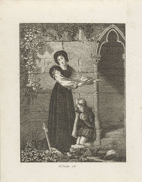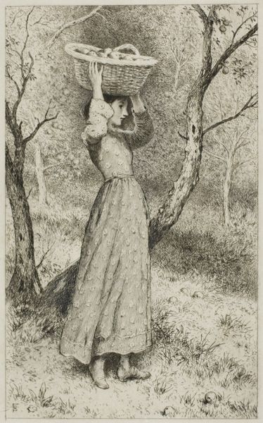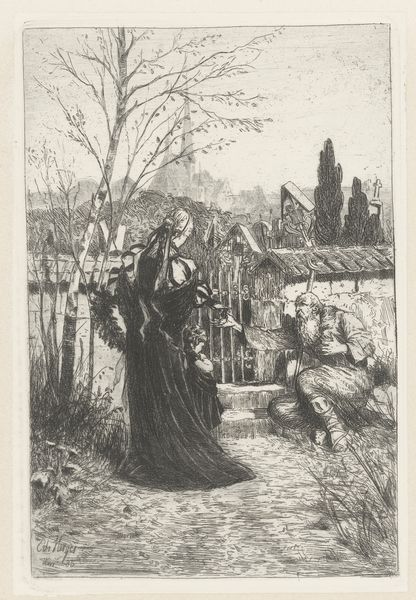 Editor: This is "The Doubt: ‘Can these Dry Bones Live?’" by Henry Alexander Bowler. It's a very moving image of a woman in a graveyard. What strikes me most is the contrast between the vibrant foliage and the grim reality of the open grave. How do you interpret this composition? Curator: The artist has masterfully deployed a high level of detail and realism to invite a formal reading that moves from death to life. Note the contrast between the dark, somber hues around the grave and the brighter, more verdant colors in the upper register. Editor: That’s a great observation about the use of color! I hadn't considered how much the artist was trying to draw a contrast between the themes using the formal elements themselves. Curator: Indeed. The artist directs our gaze through contrasts of light and dark, inviting us to consider life's cyclical nature. Editor: Thanks, I'll never see this painting the same way again.