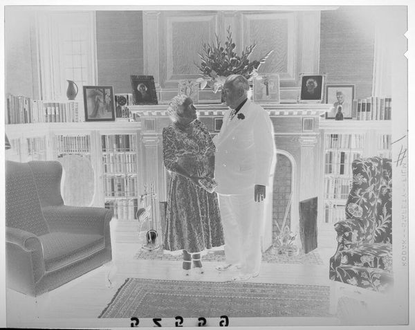 Editor: This is an untitled photograph by Martin Schweig, showing a young couple in a library setting. The composition feels very staged, almost theatrical. What strikes you most about its formal elements? Curator: The stark contrasts in the image are immediately apparent. The negative space, particularly the way the figures are positioned against the background, creates a tension. Notice how the textural variations—the floral chair, the books, the patterned curtain—contribute to a visual complexity. Editor: It is quite visually complex. I wonder, what is the effect of using this negative format? Curator: The reversal of tones flattens the image, emphasizing the graphic quality over realistic representation. It forces us to focus on the arrangement of forms and the interplay of light and shadow, rather than seeking a narrative interpretation. Editor: I see. By focusing on the graphic quality of the negative print, we notice other formal elements more clearly. Curator: Precisely. It becomes an exercise in pure visuality.