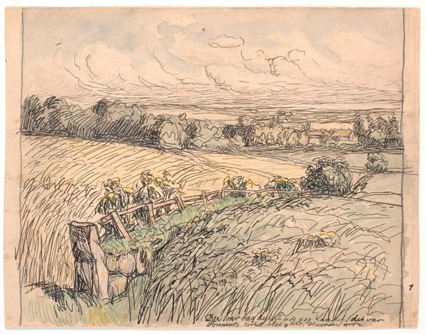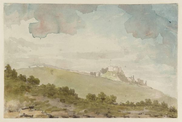 Editor: This watercolor, "Landscape with Cattle (Somerset?)," from 1830 by James Bulwer, has this wonderful, soft feeling. I'm struck by how he captures the light on the rolling hills and the stillness of the cattle. It almost feels like a memory. What do you see in this piece? Curator: Ah, yes. Bulwer’s touch is indeed gentle, isn’t it? It speaks of a deeply personal observation of the English countryside. I see not just a landscape, but a slice of Bulwer’s life, viewed through a slightly wistful lens. He's less concerned with topographical accuracy and more invested in capturing a mood, a feeling. Almost as if he's saying, "Remember this... Remember this fleeting moment of beauty.” Editor: So, the accuracy isn't the point? Curator: Not entirely. It's more about the experience of being there. Notice the light… the way it filters through the clouds? It’s quite Turner-esque, wouldn’t you agree? Almost romantic in its ethereal quality. The cattle are strategically placed, anchors in this sea of golden hues, and they invite us to pause, to breathe, to become a part of this quiet rural scene. Do you feel invited? Editor: Absolutely. The colors are really working on me. There’s almost an intimacy to it. I feel like I'm intruding on a very private moment in time. Curator: Precisely! And I believe that’s the power of Bulwer. He captures the essence, the spirit of the landscape, rather than simply rendering it. He pulls us in, making us complicit in his gentle reverie. And who wouldn't want to linger there? Editor: It’s making me want to pack a picnic! I hadn't really thought about landscape painting being so... emotional, I guess? Curator: Exactly. Art always exceeds appearances. Thank you.