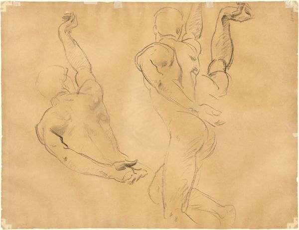 Curator: Here we have John Singer Sargent’s "Two Studies for Orpheus, for 'Orpheus and Eurydice'," currently residing at the Harvard Art Museums. Editor: He looks like he is bracing for something, maybe about to fall into an abyss, or climbing out of one. Curator: Sargent employs the nude male figure to symbolize the psychological weight of Orpheus’s descent into the underworld. The body represents vulnerability and determination simultaneously. Editor: Ah, the archetypal hero's journey... Sargent captures that moment of raw, almost animalistic, resolve perfectly. A real sense of impending drama. Curator: Indeed. A journey filled with mythical significance, echoing timeless themes of loss and redemption. Editor: It really does make you wonder about the moments of your own life, doesn't it? What abyss are we all peering into? Curator: Exactly, the power of myth is the continuous interpretation. Editor: Beautifully said.