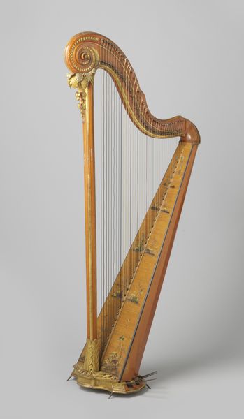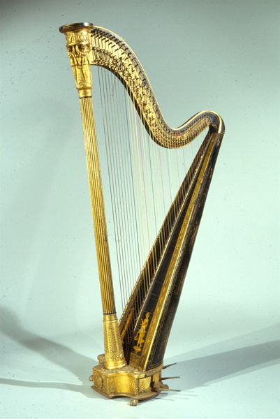 Curator: Here we have Johann Christian Schleip’s "Lyraflügel," crafted sometime between 1825 and 1844. It's currently held in the collection of the Metropolitan Museum of Art. Editor: Wow, what a statement piece! My immediate reaction is… theatrical. It's almost cartoonishly grand, in a way. The gilding really pops against the dark wood. Curator: Indeed. Schleip was clearly drawing on Romantic ideals. Consider how the form echoes classical antiquity, a deliberate referencing of history to ennoble both the instrument and, implicitly, its owner. Editor: That's a fair point, but I can't help but think about who this piano was actually for. Its ornamentation almost feels like a barrier, suggesting it was designed more to be looked at than played, perhaps speaking volumes about status and access to both music and wealth at that time. Curator: Absolutely. Think of the salons it might have occupied. The instrument becomes a locus of social performance, reinforcing class structures. The very design pushes back against utility and embraces extravagance. Editor: And that central lyre motif – its resonance goes beyond mere aesthetics. In ancient Greece, the lyre was linked to Apollo, and, of course, associated with poetic inspiration and harmony, key cultural attributes during this era. This instrument aims at signifying a link to these sources of power. Curator: It’s worth examining the symbolic capital attached to such objects. It was the early days of piano manufacturing as well, and such a creation certainly had value in constructing a vision of the "high arts" that also made room for decorative artistry as exemplified in the guilds. Editor: Right, so this isn't just about the music, it’s about the whole performance of class, taste, and access to cultural lineage. A heavy weight for something intended to make pretty sounds. Curator: The "Lyraflügel," beyond being a musical instrument, becomes a lens through which we examine social hierarchies and cultural values of the time. Editor: Well, it's certainly given me plenty to consider regarding how art objects both reflect and shape social dynamics. Curator: Precisely. Looking deeper, art like this helps us re-examine the relationship between the aesthetic and the political throughout history.