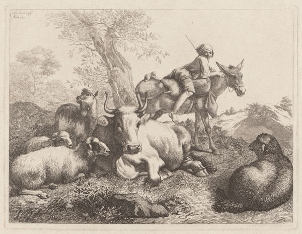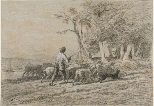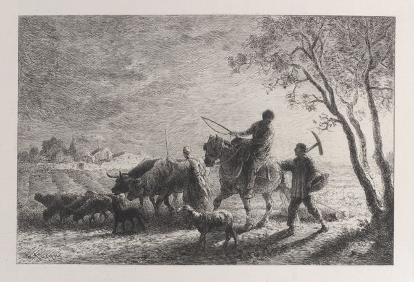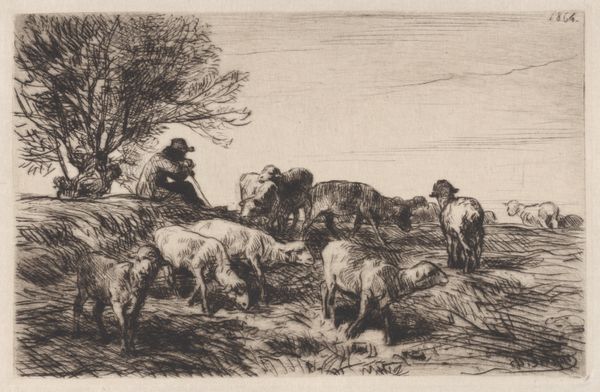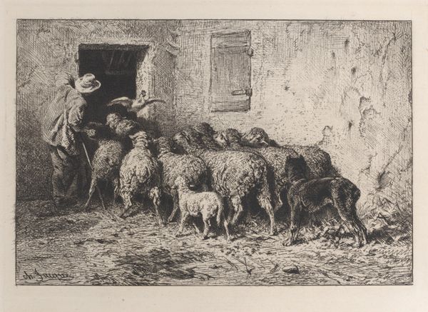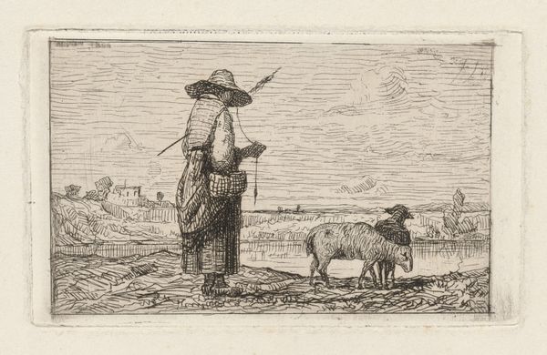 Charles Jacque created this print, "Arrival in the Field," using etching. At first glance, we see a landscape dominated by varied textures. The foreground bristles with finely rendered grasses, leading the eye toward a dense cluster of sheep. A shepherd and his dog bookend the herd, setting a rhythm across the composition. Jacque's technical skill is apparent in the tonal variations he achieves with etching. Notice how he uses darker, concentrated lines to define the sheep and shepherd, creating a focal point against the lighter, more open sky. The buildings in the background are suggested, not precisely depicted, inviting us to consider the relationship between rural life and the broader world. What's compelling here is not just the scene, but the very act of representation. Each etched line contributes to a larger meditation on light, texture, and space. Jacque captures the pastoral tradition not as a static image, but as a dynamic interplay between form and content.