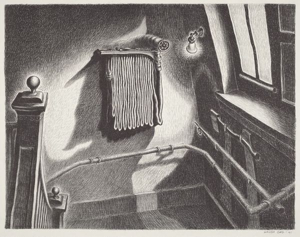 Helen Lundeberg made this lithograph, Enigma, date unknown, and it’s a trip into seeing. The subtle gradations of gray, built up from countless tiny marks, give a real sense of volume to the objects she depicts. It’s all process, a slow build, a very particular way of seeing the world, and then making it. Looking closely, the surface feels almost velvety, with a tangible density to the shadows, especially the way the shadow of the chair falls on the floor. The lightbulb in the mirror looks as though it's floating. The objects feel both familiar and strange, like a dream. And that shell sitting on the chair: is it a memento, a symbolic element, or just a thing? I’m reminded of Giorgio Morandi and his still lifes, that same interest in the quiet power of everyday objects. But ultimately, Enigma has its own mysterious and compelling presence. It shows us that art is often about posing questions, not answering them.