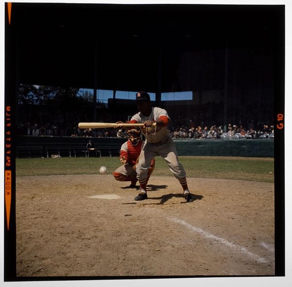 Editor: This photograph by Jack Gould captures Stan Musial in action. The composition, with its stark contrast, really emphasizes the motion, doesn't it? How can we interpret the image in the context of American culture? Curator: Absolutely. Consider baseball's role as a national pastime and how figures like Musial become symbolic. What narratives are being reinforced, and whose stories might be absent? This photo, like many in sports, can embody notions of American exceptionalism and masculinity. Editor: So, you're saying it is not just a photo of a baseball player? Curator: Precisely. It invites us to examine the broader socio-political context. Who gets celebrated and why? What are the power dynamics at play? Editor: I see it. It’s made me rethink how seemingly simple images can carry deeper meanings. Curator: Exactly, and that critical lens is essential.