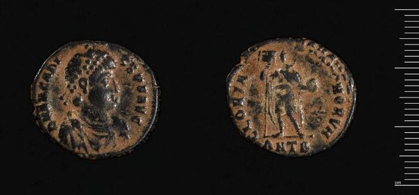 Curator: Here we have a bronze coin of Arcadius, minted in Antioch, that weighs under 3 grams. Editor: It's remarkable how much information is communicated on such a tiny object, even after centuries of wear. There's a ghostly quality to the figures. Curator: Indeed. Coins like this were less about pure monetary value, and more about disseminating imagery of power and imperial ideology. This served to reinforce the emperor's divine right to rule. Editor: It's fascinating how even something as simple as money, in its materiality, becomes a tool for social control and the propagation of a dominant narrative. Who gets represented, and how, is always political. Curator: Absolutely. It's a potent reminder of how art functions within broader power structures. Editor: Considering the legacy and impact of this artwork, I realize objects can be so much more than meets the eye.