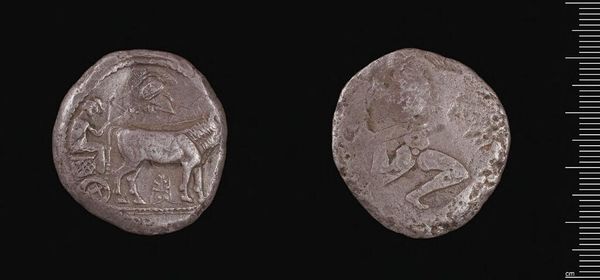 Editor: Here we have a silver tetradrachm of Alexander the Great, minted in Macedonia. The relief carving is quite striking! What compositional elements stand out to you? Curator: The coin's value lies in its intrinsic elements: the circular format dictates the composition, with the figural relief conforming to its constraints. Note the high relief; a technical feat for such a small object. What visual cues indicate the subject's power? Editor: Well, the figure seems to be Zeus, and his seated posture seems to command the space. Curator: Precisely. The formal arrangement—the god's dominance within the circular field—contributes to the coin's symbolic weight. Also, consider the material itself. Editor: How so? Curator: Silver, a valuable metal, enhances the coin’s function as a signifier of wealth and authority, reinforcing the depicted imagery. Editor: That's a fascinating perspective; it makes you look at a coin in a new way! Curator: Indeed. Considering the interplay between form and material enriches our appreciation.