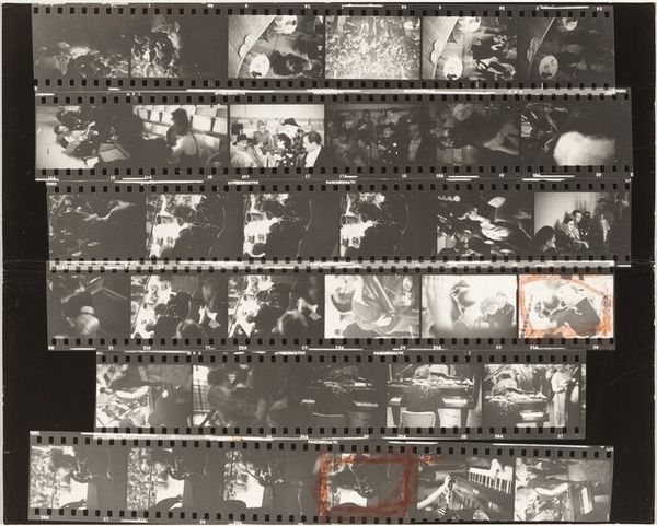 Robert Frank created ‘Paris 53B’ using photography, a process that chemically imprints light onto a sensitized material. Here, we see strips of black and white film mounted on a larger black card, which allows us to peek behind the curtain of Frank’s artistic process. The film's materiality, with its sprocket holes and frame edges, influences how we perceive these captured moments. Photography, unlike painting or sculpture, is inherently tied to mechanical reproduction and the commodification of images. Frank's loose, seemingly casual framing counters the slickness often associated with commercial photography. Consider the labor involved: from manufacturing the film itself, to Frank's work as a photographer navigating the streets of Paris, to the darkroom processes required to develop these images. The numbered annotations also point to an editorial process of selection, mediated by a commercial logic. By revealing the raw materials and process, Frank elevates the everyday into art, questioning the boundaries between high art and the working world.