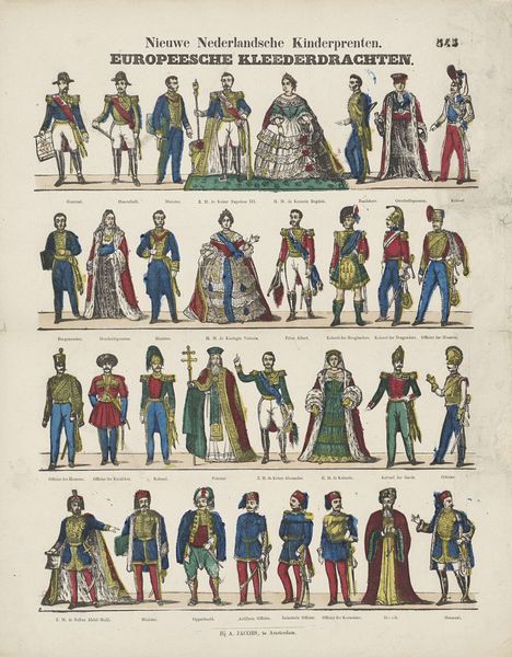 Editor: This is “Burgerwacht van België / Garde civique de la Belgique,” a lithograph made sometime between 1833 and 1911 by Brepols & Dierckx zoon. It’s got this almost scientific illustration feel, cataloging different uniforms. What stands out to you about this print? Curator: What I find fascinating is how this print presents a standardization of labor and identity through the crafting of these uniforms. Notice how each row denotes a different type of worker-soldier, categorized by their attire, the material signifier of their role within the Belgian Civil Guard. It’s not just about the image; it's about the socio-economic system it implies. How were these uniforms produced? Who made them? Editor: So, you're saying the focus shifts from the aesthetic representation to the means of production and the people involved in that? Curator: Exactly! The lithograph itself becomes a document of industrial processes and the social hierarchy inherent in military structure. The image subtly points to the division of labor. We have different types of uniforms depending on duties and locale, speaking volumes about 19th century Belgian society. Consider the contrast in fabrics, dyes, even buttons—what do those differences tell us about access to resources? Editor: That’s interesting. I hadn't thought about it that way, but seeing it as a record of material culture makes it much more complex. I am looking now into those minute visual and textural differentiations. Curator: And what does it mean that this was a widely reproduced print? How does this widespread circulation reinforce notions of civic duty or national identity, or the accessibility of information within a society structured around economic disparities? Editor: I guess it forces you to consider the political and economic implications tied to artistic production, not just the artistic skill. Curator: Precisely. Hopefully you consider not only the artist’s hand, but also the hands of those who produced the very materials upon which art is made.