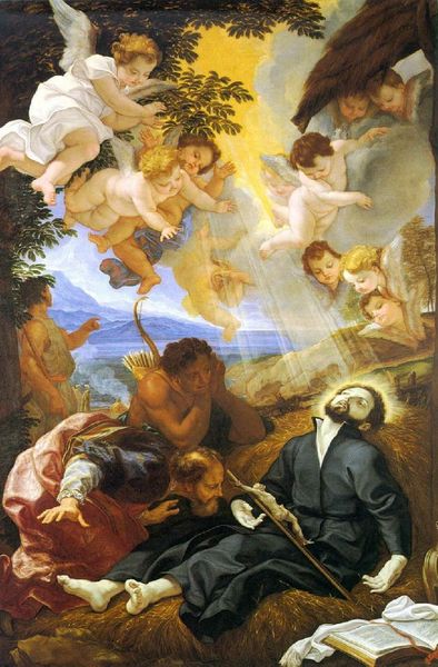 Curator: This compelling oil on canvas is Guido Reni's "St Francis Consoled by Angelic Music," created around 1610. The artwork embodies elements of both the Italian Renaissance and Baroque periods. Editor: It hits me as both intimate and vast at the same time, which is a neat trick. I'm drawn to the shadowy vulnerability of Saint Francis and the gossamer lightness of that floating angel. Like a whispered dream, you know? Curator: Absolutely, and dreams are quite relevant here. Reni captures Francis at a pivotal point, contemplating mortality. He rests his hand on a skull—a memento mori—while heavenly music is delivered to him, signifying divine comfort. Editor: That skull on his lap—it's like Francis is holding the world's most morbid paperweight. Then BAM! An angel appears, rocking a violin solo, ready to blow away all the darkness, maybe into something sublime. I can practically hear that violin, a pure crystalline note... Curator: Considering Francis's deep commitment to poverty, charity, and his devotion to faith, we should recognize this image speaks to some deeply conflicted views about what it means to live, suffer, and have faith in that period. Editor: True, that score in the background—along with Francis, like, actually owning a book—really underscores what was at stake at that moment in history for ordinary and faithful people. Curator: The dramatic lighting and contrasting darkness really amplifies his spirituality, showing the tension of an era marked by intense religious contemplation but also deep political anxieties in the Italian Renaissance. Editor: What Reni did with the Baroque style makes it, I think, pretty irresistible, even today. I feel that ache of existential longing radiating off old Francis. Like, who hasn’t been there? But then… angel music! Relief. A total mood shift. Maybe there is a point to everything after all. Curator: And perhaps, in grappling with these contrasting perspectives, we better confront historical tensions of class and power too. Editor: Reni gets it all swirling together in the composition… sorrow, comfort, questions of earthly power, fleeting moments of heavenly beauty. Bravo.