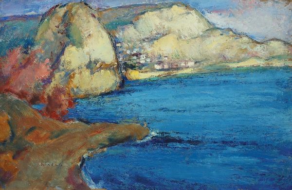 Kimon Loghi painted this oil on canvas, called Biarritz, with horizontal bands of color, creating a tranquil seaside scene. Notice how the composition is structured around the interplay between the cool blues of the sea and sky, and the warmer pinks and oranges of the land. The painting's formal qualities evoke a sense of calm and openness. The horizon line is low, giving prominence to the sky, which occupies about half the canvas, and the artist’s brushstrokes are loose and expressive, particularly in the rendering of the clouds and water. This technique captures the fluidity and movement of the scene. Loghi challenges the conventional landscape. He employs color and texture to convey an experience of place rather than a precise depiction. The painting invites ongoing interpretation, asking us to consider how Loghi uses visual elements to shape our perception and understanding of the natural world.