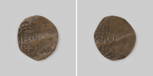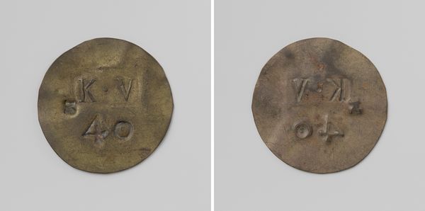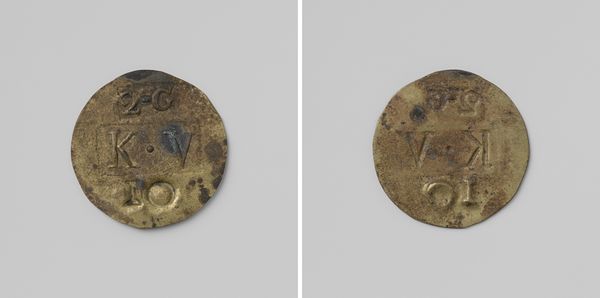 This anonymous token of twenty cents, likely struck from copper, was commissioned by the Maatschappij van Weldadigheid for use in the Veenhuizen colony. Notice the composition: on one face, we see the inscription "3-G" enclosed in a box-like structure, under which a larger box frames "K.V." Above the number "20" the surface is punctuated by a circle. The other face of the token shows a similar arrangement of the boxed inscription and number, though with a deliberate wearing down of these graphic elements. The token's circular form, with the inscriptions it bears, functions as a system of signs, a symbolic medium, that once governed exchange within the confines of Veenhuizen. Consider how the token, in its materiality and design, challenges conventional notions of value and currency. It's a stark reminder of the power structures inherent in systems of exchange and the human cost of social engineering.