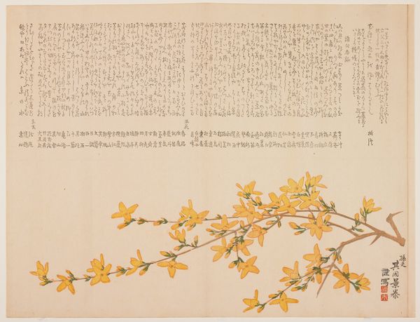 This is Shibata Zeshin’s "Bamboo Poetry Sheet," made at an unknown date. It's a print with ink and color on paper. The composition divides the page into distinct realms. On the right, we see the bamboo, rendered in a cool palette of greens, that provides a stark contrast to the pale ivory expanse on the left, which is filled with lines of delicately inscribed text. The bamboo is stylized, almost geometric in its rendering, embodying a certain rigidity and order. The arrangement suggests a dialogue between nature and culture. The bamboo, with its verticality, introduces a sense of growth and organic vitality, yet it is contained, much like the regimented characters of the text. The text, while full of potential narratives, is fixed within the grid-like structure, creating a visual tension between expression and constraint. The stark contrast in texture—the smooth, almost glossy finish of the bamboo against the matte, subtly textured paper—invites a tactile contemplation. The space between the bamboo and the text is as significant as the elements themselves, a void that allows each to retain its distinct identity. The visual structure of this "Bamboo Poetry Sheet" reflects not just an aesthetic choice but a structured meditation on nature, language, and the spaces between them.