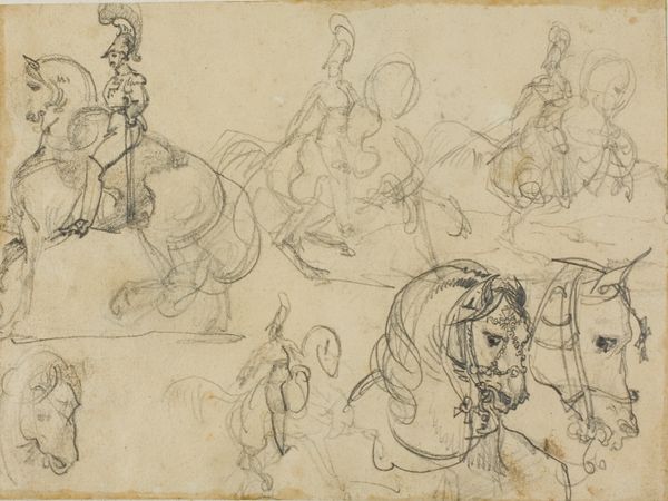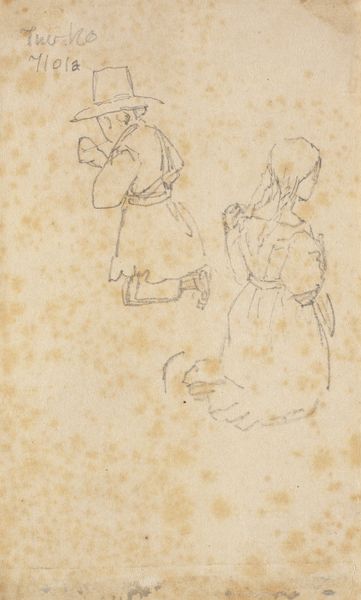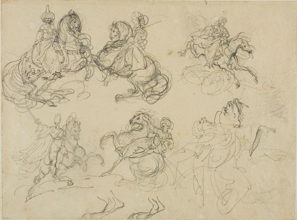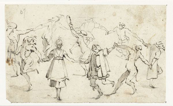Editor: This drawing, "Sketches of Dancing Peasants" by Hendrik Abraham Klinkhamer, was created sometime between 1820 and 1872 using pencil on paper. It's currently held at the Rijksmuseum. I'm struck by how the lightness of the pencil creates such a fleeting, ephemeral feeling. What do you see in this piece? Curator: It's interesting that you pick up on that ephemeral quality. For me, these aren't just figures dancing, they’re embodiments of communal joy and fleeting moments of shared experience. Consider the hats adorned with flowers. Flowers, especially in the Romantic period, carried a potent symbolic language. They speak of ephemerality, yes, but also of love, celebration, and a connection to nature. What might that suggest about the people depicted? Editor: It suggests they’re deeply connected to the land, and maybe their celebrations are tied to specific seasonal changes? It also feels a bit idealized, almost like a memory of simpler times. Curator: Precisely! The "genre painting" aspect reinforces this. These dances likely weren’t captured in the moment, but remembered, reconstructed through cultural memory. Klinkhamer is not merely sketching; he's preserving an idea of Dutch folk culture, idealizing their spirit through dance and costume. Notice how no one's face is perfectly detailed - they represent types, not individuals, drawing upon deeply rooted archetypes of peasantry. Editor: So the “sketches” label almost hides how carefully constructed these images are, less reportage, and more symbolic reconstruction. Curator: Exactly. These “sketches” resonate as fragments of a cultural mirror, reflecting a longing for an imagined past, for something authentic. The artist's light touch serves not to diminish the scene, but to imbue it with a tender, nostalgic aura, prompting us to contemplate what has been lost, or perhaps, reimagined. Editor: That’s given me a lot to think about! I had not considered this was idealizing, perhaps, even creating a memory that wasn’t quite real. Thank you for that fascinating interpretation!