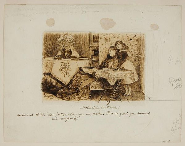 This is an invitation to a benefit dinner from Hubert von Herkomer to Thomas Agnew, rendered as a monochromatic drawing. At first glance, the eye is drawn to a tableau of artistic allegory and social appeal. The composition is bisected, staging figures that blend classical motifs with poignant commentary. On the left, a muse sits beside an easel, palette in hand. To the right, are figures in repose, watched over by a grim reaper. Above, divine figures loom, adding a spiritual dimension to the scene. The artist used sepia tones to evoke a sense of nostalgia. The layout is more than just a visual enticement. The artist invites the viewer to consider the role of the artist in society and the interplay between mortality and art. By doing so, this work acts as a profound reflection on the human condition. The interplay of light and shadow, form and concept, asks us to see beyond its surface into a complex dialogue about charity, artistry, and existence.