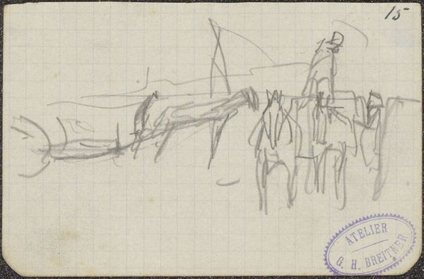 Editor: Here we have George Hendrik Breitner's 1890 graphite drawing, "Paarden en sleperskarren," or "Horses and Towing Carts." It feels very fleeting and immediate. What do you see in this piece, from a formal perspective? Curator: What strikes me immediately is the dynamic interplay between line and void. Breitner isn't so much depicting horses and carts as he is exploring the gestural potential of graphite on paper. Note the repeated use of short, broken lines and how they create a sense of movement. Consider the spatial relationship—does it conform to Renaissance perspective? Editor: I don't think so. It feels quite compressed. Almost flattened. Curator: Precisely. And observe how the artist uses the grid of the paper as a compositional element, creating a tension between the representational image and the underlying structure. How does this grid alter your viewing experience? Editor: It makes me think about the artistic process itself – it’s almost like a sketch from a notebook. Less like a finished piece, more like the seed of an idea. Curator: Indeed. The drawing privileges the act of seeing over the object seen, blurring boundaries between artwork and preliminary sketch. Would you agree that it captures a fragment, distilled to its fundamental visual components, which elevates our focus onto lines, marks, and paper texture, independent of narrative content? Editor: I think I agree! It’s less about horses and carts, and more about how we perceive movement and form. Thanks, I found your reading of line and composition particularly insightful. Curator: Likewise, your point regarding process is essential when engaging formally with an artwork like this.
