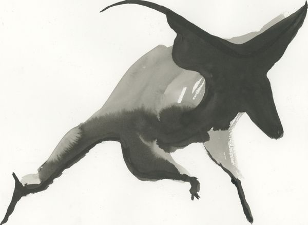 Curator: This is Dame Elisabeth Frink's "Boar", currently residing in the Tate Collections. The print measures 524 by 654 mm. Editor: Immediately, I notice a ghostly quality. The layering creates a sense of movement or unease, it's fascinating. Curator: Frink's treatment of form is compelling. The repetition, the shifting densities of tone, lend themselves to an exploration of mass and volume. Editor: Frink was producing such works during the Cold War, and one must wonder if these powerful animals become metaphors for strength, or even aggression, given the socio-political climate of the time. Curator: Indeed, however, I find the formal qualities alone create sufficient tension, regardless of external contextual factors. The composition focuses on the interplay between light and shadow. Editor: I concede that the stark contrast certainly adds to the drama, but I cannot divorce the image from its potential political readings. Curator: Ultimately, this work offers diverse readings depending on one's perspective. Editor: A fascinating piece to consider both for its formal beauty and its historical context.