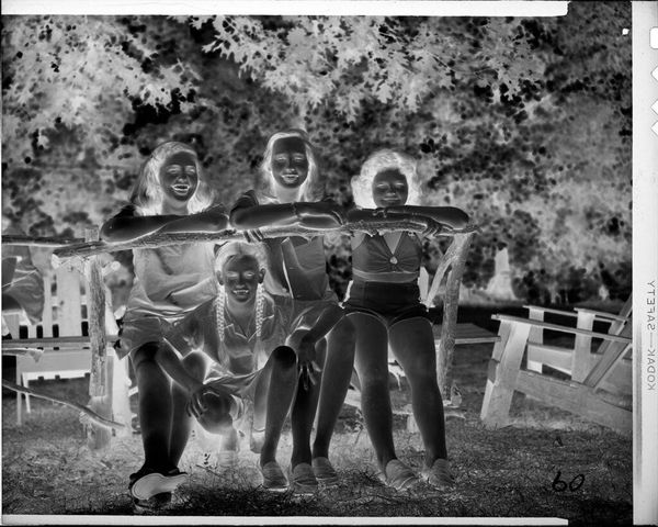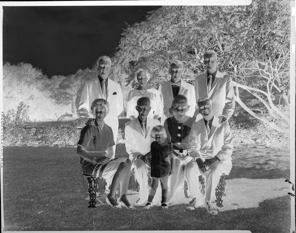 Editor: Here we have John Howell's "Untitled (family portrait outside)," a small gelatin silver print. It’s interesting to see a family portrait presented as a negative. What does this inverted image suggest to you? Curator: The inversion emphasizes the photographic process itself, reminding us of the constructed nature of image-making. Consider how family portraits have historically functioned as representations of social standing and idealized family structures. Does this negative challenge or reinforce those conventions, do you think? Editor: I suppose it does. It looks like the start of something - an unformed memory. Thanks for sharing that perspective! Curator: And thank you, I will keep that in mind next time I see it.