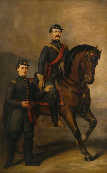 Editor: Here we have Emil Hünten's "Kaiser Wilhelm I Und Kronprinz Friedrich Zu Pferde," an oil painting depicting two figures on horseback. I’m immediately drawn to the muted palette and the dynamic composition. What strikes you about this work? Curator: The spatial relationships intrigue me. Note how the foregrounded figures are rendered with greater detail and clarity. How does this calculated deployment of focus affect your reading of the piece? Editor: Well, the detail definitely pulls my eye to the figures of Wilhelm and Friedrich, suggesting their importance. Is there any semiotic intention here? Curator: Precisely. The contrast creates a visual hierarchy. The artist manipulates depth of field to isolate and elevate specific elements, thereby creating symbolism, a way of signaling power, importance and maybe something else. What visual cues contribute to this feeling? Editor: I think the upright posture of both Wilhelm and Friedrich, paired with the strong, diagonal lines of their horses' legs create a sense of forward momentum and confidence. What do you think? Curator: Agreed. It is through these structural choices—line, form, focus, tone —that Hünten crafts not just a portrait, but an idealized statement about leadership and legacy. The controlled energy, achieved through careful composition, conveys authority. The work eschews overt narrative, opting instead for a formal declaration. Editor: That's interesting, I hadn't thought about the absence of narrative as a deliberate choice. Looking at how the artist uses line and form, it becomes much clearer how impactful they can be, and how they generate all this visual weight. Curator: Exactly! Now, reflect on how the restrained palette and blurred background interact with these strong formal elements. Does this change how you feel? Editor: I see now how the seemingly muted background makes us focus solely on the two horsemen at the center of the piece!