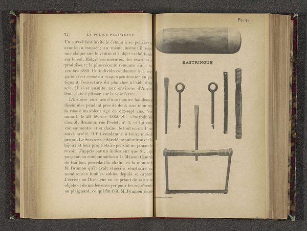 Editor: This is "Seal Engraving" by A. J. de Fehrt. It's a black and white print showing tools and materials for seal engraving. The composition is quite ordered and diagrammatic. How would you interpret this from a formalist perspective? Curator: I observe a deliberate arrangement of geometric forms, presented without a grounding context. The lines are precise, clean, and primary, devoid of expressive modulation. The composition seems concerned less with representation and more with the inherent structure and order of forms. Editor: So, the focus is on the relationship between the shapes themselves rather than what they represent? Curator: Precisely. Note the interplay of positive and negative space, the variation in scale, and the calculated repetition of elements. These formal relationships constitute the essence of the work. Is that something you noticed? Editor: That's fascinating! I hadn't considered how the visual structure itself conveys meaning. Curator: Yes, and such analysis reveals a deeper understanding.