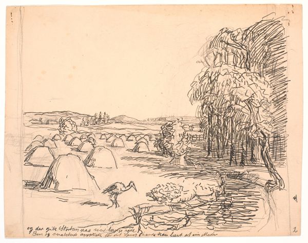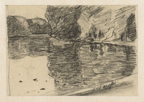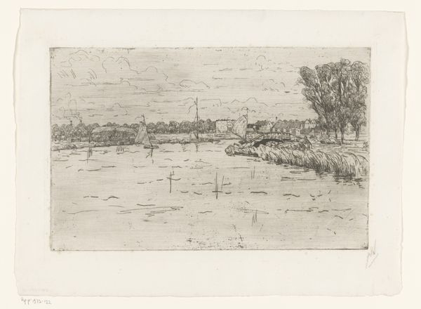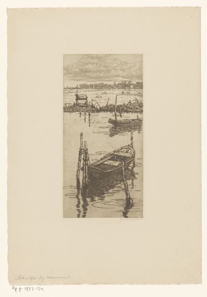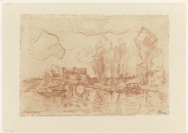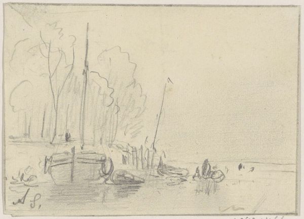 Editor: We're looking at "Rowboat on a Lake" by Maurits van der Valk, likely created between 1867 and 1914. It's an ink drawing housed here at the Rijksmuseum. I'm immediately struck by the quiet stillness of it; the water's surface seems so calm. How do you read this piece? Curator: Formally, the composition orchestrates a delicate balance between representation and abstraction. Observe the linear quality, especially the emphasis on line over tonal variation which constructs a pictorial space governed more by suggestion than by photographic realism. Note how the varying line weights and densities imply form and texture. Do you notice the relationship between the reflective quality of the water and the static elements within the scene? Editor: I see what you mean. The reflections are really interesting, they're more gestural, less defined than the bridge or the boats. The artist seems less interested in perfectly mimicking reality than giving a general impression. Curator: Precisely. The artist uses economy of means. The lines aren't just descriptive; they create depth, and suggest texture and movement within a seemingly still image. The materiality of the ink itself becomes integral to the artwork's aesthetic impact. How does that resonate with you? Editor: It’s interesting to think about how the limitations of the medium actually create the mood. The starkness, the absence of colour, really emphasizes the stillness. Curator: A worthwhile observation. Thinking about it, Van der Valk prioritizes an engagement with the formal elements: line, composition, and the intrinsic qualities of ink on paper over purely mimetic representation. Editor: I’m definitely seeing more now about how much the medium itself shapes the message. Thanks! Curator: Indeed. And it underlines the capacity of drawing, despite its seeming simplicity, to convey complex aesthetic and emotional experiences.