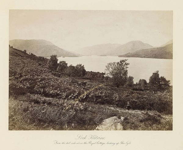 Curator: This is "Windermere," an albumen print made by Roger Fenton around 1850. The composition features a serene landscape, almost meditative. Editor: Yes, immediately I feel this muted serenity. The soft, hazy tones almost give it the quality of a dream. But the branch intruding at the top—what is that about? Curator: That's interesting. Fenton was one of the first to make landscape photographs en plein air, a common practice in painting. We see this branch and these other details because he wasn’t just staging a scene—this image is more closely tethered to the natural world. His patron class valued their English estates; thus, scenes like these had high cultural capital at the time. Editor: Right, and this landscape genre itself evokes a symbolic journey. Lakes and mountains frequently represented enlightenment and spiritual quests. Look how the lake leads the eye, promising escape and reflection, but then...it's also framed by this sort of visual "gate" of foliage. Do you think it has an effect on a contemporary audience? Curator: I believe so. Early photography occupied an interesting position. While it was perceived as an objective medium, subjects such as this picturesque vista are framed to emphasize harmony. The composition, including this rather imposing foliage in the upper left corner, feels intentional, echoing romantic painters like Turner or Constable. Editor: The Romantic painters used landscapes to evoke specific feelings, to connect to deeper truths through nature. Does the tonal range here have any affect on these feelings? Curator: For certain, and keep in mind that these early photographic processes often yielded images with limited tonal range and contrast compared to what we are accustomed to now, influencing their interpretation and the market for art. Editor: All the more impressive, then, that Fenton was able to create such depth and such evocative detail. I look at it now, this isn’t just a photograph—it is a portal. Curator: Exactly. Fenton’s "Windermere" functions as a powerful reminder of how landscape, whether painted or photographed, operates both as a mirror reflecting cultural values, and also as a window. Editor: Nicely said. So the lake as mirror *and* window...I see why this piece continues to resonate today.