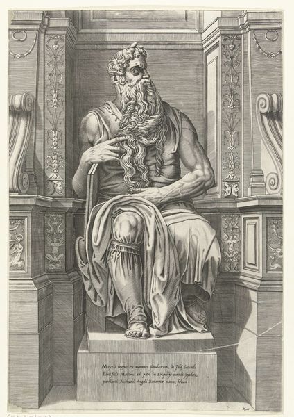 Editor: This is Jacob Matham’s "Aaron," an engraving from around 1600 to 1604. The detail achieved through the line work is striking, especially in the rendering of fabrics and textures. How do you interpret this work, focusing on its formal elements? Curator: Observe the meticulously rendered lines defining form and texture. Notice how the artist employs varying densities of hatching and cross-hatching to create depth and volume in Aaron's garments. How does this level of detail contribute to your experience of the work? Editor: It creates a sense of weight and substance, doesn't it? The folds of the robes seem almost tangible. And the ornamentation feels very intricate... It gives it all a grandeur. Curator: Precisely. Now, consider the composition: the figure is centrally positioned, dominating the pictorial space. The subtle play of light and shadow across his face directs our gaze and endows him with an almost regal solemnity. How does Matham balance the figure's static pose with a sense of dynamism? Editor: I see what you mean! Although Aaron is sitting, the swirling smoke, the texture on his sleeves, plus that flowering rod introduce a kind of motion or implied motion in this otherwise stately and somewhat formal portrait. Curator: Indeed. And Matham uses line to convey so many qualities—weight, shadow, substance—truly exquisite and intentional. Editor: Looking closely, I've noticed elements that were less apparent at first. Thank you for offering this new perspective! Curator: It’s been my pleasure. Considering formal structures in this way enhances our appreciation for the artistry involved.