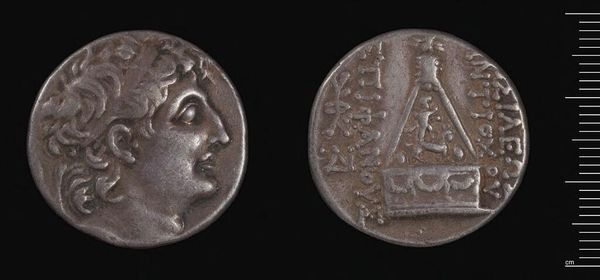 Curator: Here we have a Tetradrachm of Alexander I Balas, a coin currently held in the Harvard Art Museums. The coin is silver. Editor: It feels instantly… weighty. All that history pressed into one small, tarnished disc. Makes you wonder what hands it passed through, doesn't it? Curator: Indeed. Notice the artistry, though—the careful detail in the depiction of Alexander I, crowned with laurel, on one side. And on the reverse, Zeus seated, holding Nike. Editor: The figure of Zeus feels less regal, more human somehow. And the textures! The way the metal's been worked to create such intricate details – it's quite something. Curator: Consider the symbolism, too. The laurel wreath signifying victory, Zeus representing divine authority… Alexander was clearly trying to make a statement. Editor: A statement pressed into something that could be easily spent. What a fleeting, almost absurd way to declare immortality. Curator: It's a potent reminder of the past, of power and ambition… and the impermanence of it all. Editor: Yes, a beautiful object that makes you reflect on what we value, what we leave behind.
