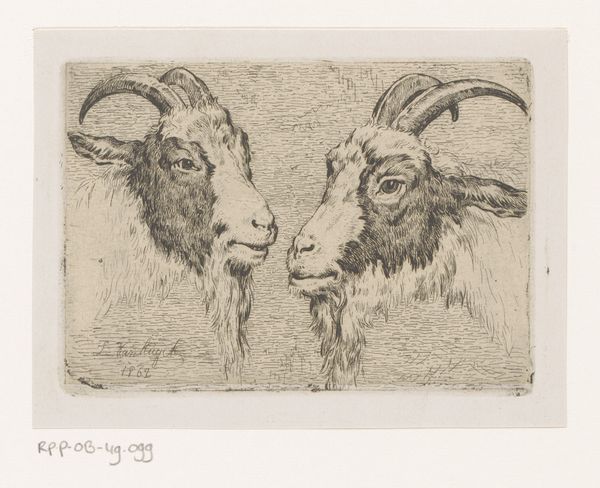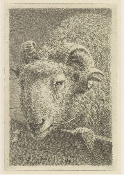 Hendrik Stokvisch rendered this study of a ram’s head using chalk. The drawing centers on the animal’s face, dominated by its spiraling horns and dense wool, giving it a powerful, almost sculptural presence. The use of chalk allows for a rich interplay of light and shadow, creating a dynamic texture across the ram's face and fleece. Stokvisch’s marks are not merely descriptive; they are expressive, imbuing the animal with a palpable sense of vitality. The composition focuses on the ram's head, cropped tightly to amplify its imposing features, suggesting both strength and vulnerability. The drawing's formal qualities reflect broader concerns of the period, where the depiction of animals often served as a means to explore themes of nature, power, and the sublime. Stokvisch captures the essence of the ram, inviting viewers to reflect on the complex relationship between humans and the natural world.