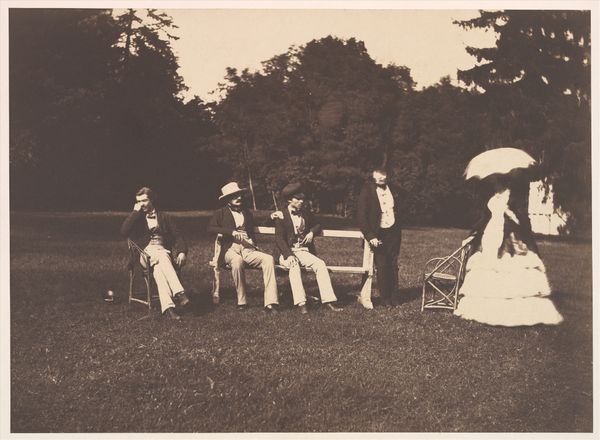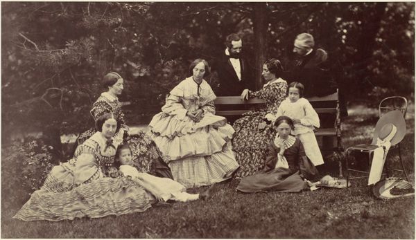 Editor: Here we have William Henry Fox Talbot’s “The Fruit Sellers,” made sometime between 1843 and 1847. It's a gelatin-silver print, and the scene, although blurry, depicts a group of people with piles of fruit. What strikes me most is the almost dreamlike quality; how would you interpret the composition? Curator: Focusing on the visual, observe the strategic arrangement of the figures. Talbot employs a pyramidal structure, grounding the composition with the fruit piles. The light, although diffuse, appears to emanate from the upper right, casting nuanced shadows that define form and texture. Editor: I see the pyramid shape you mean. So, the tonal range contributes to the overall aesthetic rather than representing something specific about the people or context? Curator: Precisely. Note the limited tonal palette – a characteristic of early photography. It is through these gradations of light and shadow that Talbot establishes spatial relationships and directs the viewer’s gaze. Consider how the textural contrast between the architectural backdrop and the soft foliage engages the eye. Editor: So it’s more about the relationships *between* elements, not the elements themselves as representations? Curator: Indeed. This reading prioritizes the formal interactions. Consider the rhythmic repetition of forms, the balance between light and dark – these formal elements coalesce to create a self-contained aesthetic experience. Editor: I never thought about photography having such carefully structured compositions back then, I assumed they were simple snapshots of reality. Curator: Many believed photography was purely representational. Talbot proves the artistic intent behind early photography. Hopefully, it encourages looking beyond mere subject matter to analyze the inherent visual structure.