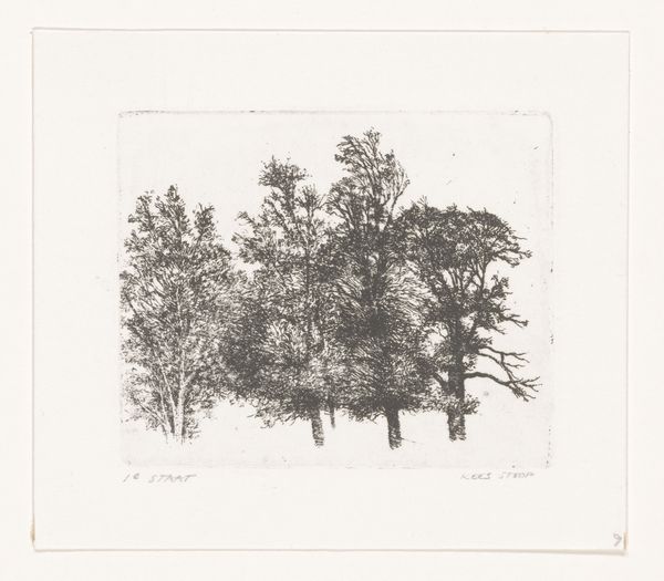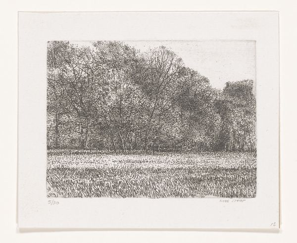 Curator: Here we have Kees Stoop’s print titled "Bos," believed to have been created sometime between 1944 and 1990. It’s an etching. Editor: You know, right off the bat, I’m getting a real wintry vibe from this. Bare trees, maybe even a dusting of snow suggested in that field…it feels cold and still. Curator: The choice of medium, etching, really lends itself to that atmosphere. The fine lines create a sense of depth and detail in the forest scene. The landscape genre itself evokes Romanticism, with a modern treatment of light. The starkness almost acts as a critique of idealized depictions of nature. What’s illuminated, and why? Editor: Critiques aside, I keep getting pulled into that light, too! It hits the front of the forest and really pops those spindly branches out. It makes me think of all those hidden things nestled inside that wooded space—you know, like secrets? The lack of color only heightens the dramatic effect. Curator: Precisely! Think about post-war Netherlands— the landscape is often a site of trauma, of reflection, where themes of reconstruction and collective identity emerge. The monochromatic palette could reflect scarcity but is primarily the result of etching, where tonal gradations reflect degrees of mark-making on a plate rather than pigment. What social narratives does a simple landscape conceal? Editor: Yeah… hidden history. So, with this work, Stoop’s inviting us to contemplate—in both senses of the word, like looking, but also deeply considering. There is some power to seeing landscapes without any human subjects. Curator: It refocuses our gaze. As an etching, we must also account for class. Prints were some of the first mediums to bring fine art to a middle class. Did access influence public sentiments? Editor: Okay, that is making me rethink what I see here now, knowing how social forces can be at play even in how the forest is being visualized. Curator: The layers of interpretation with artworks like this are what make them so rewarding to explore. We project, analyze, learn, and grow through visual arts. Editor: Amen to that! I am still cozying up to that initial wintry reading and am glad to better understand the artwork’s more historical elements, and how to contemplate their relationship to me as the viewer.