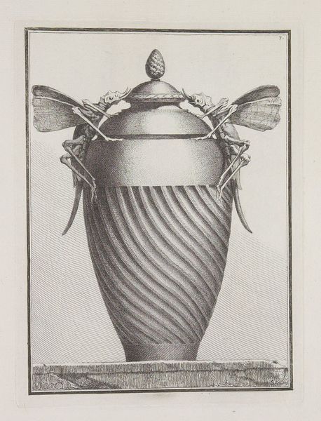 Editor: So, this is “Pot met deksel met insecten als ornament,” a pen and ink drawing from 1764 by Benigno Bossi, currently held at the Rijksmuseum. What strikes me is this bizarre contrast: such a classical vase shape adorned with what looks like giant, somewhat menacing, insects. How do you interpret this juxtaposition? Curator: It's fascinating, isn’t it? Beyond the initial shock, let’s consider what Bossi, as an ornamental designer, might be subtly critiquing. This was the height of the Baroque period. Ornamentation was, literally and figuratively, layered onto structures of power. Is Bossi using these insects – traditionally symbols of decay and the fleeting nature of life – to suggest a potential collapse of such elaborate, perhaps even oppressive, systems? Does this piece speak to a growing discontent with excess and a yearning for simpler forms? Editor: That’s a really interesting angle! I hadn't considered it as a form of social commentary, but the insect imagery as a potential symbol of societal decay makes sense. Is it possible that Bossi's use of insects is intended ironically rather than as straightforward criticism? Curator: Absolutely. The Baroque was also a period of incredible scientific advancement, specifically in the field of entomology. These detailed insect depictions could be read as emblems of scientific curiosity transforming our perception of power dynamics. Think about how understanding the minute details of seemingly insignificant beings can provide new lenses to challenge those same long held structures. What could something small reveal? Editor: That gives me a completely new perspective. It moves beyond the visual strangeness and suggests this intricate layering of social commentary and scientific inquiry. Curator: Exactly. These period pieces were often so dense in messaging! Reflecting on today, I can't help but consider how "Pot met deksel met insecten als ornament” fits within today's conversations surrounding power and structure. Editor: Yes, by challenging conventional aesthetics, the artist encouraged others to think about power structures from different perspectives, even to this day.
