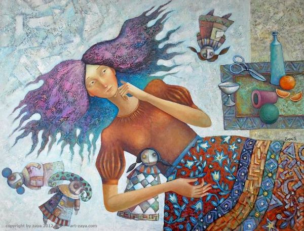 Zaya’s painting shows us a pregnant woman with scissors, captured in a moment laden with symbolism. The act of cutting hair, a potent motif across cultures, traditionally signifies change, a break from the past, or even mourning. In ancient rituals, hair was believed to hold life force, so cutting it was a symbolic sacrifice. Think of Samson, whose strength resided in his locks. Here, the pregnant figure, a symbol of creation, is simultaneously engaged in an act of severance. This duality evokes a deep psychological tension. Hair is often associated with beauty and femininity. By choosing to cut it, the woman may be reclaiming her identity, asserting control over her changing body, and preparing for the transformations of motherhood. The cyclical nature of this symbolic act, from sacrifice to empowerment, reveals how deeply rooted these images are in our collective memory. This image engages us on a subconscious level, prompting us to reflect on the constant ebb and flow of life, death, and rebirth.