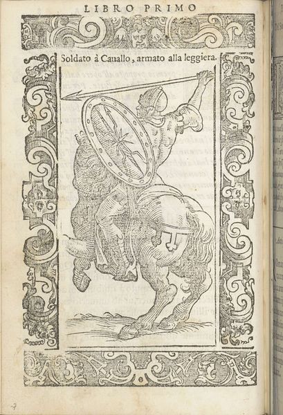 Editor: So, this engraving, "Donna di Biarmia," made around 1598 by Christoph Krieger, really caught my eye. It feels like a scene ripped from a history book, but there's a certain starkness in its lines. What do you make of its overall composition? Curator: The first thing that strikes me is the line work. Observe the artist's strategic use of hatching and cross-hatching to create tonal variations, almost mimicking the textures of fur and fabric. Notice how this technique not only defines form, creating three dimensionality from essentially two, but contributes to the overall dynamic composition as well. Editor: I do see that now. The lines almost give it movement, especially in the woman's clothing. What about the borders with the cherubs and grotesques, do they add something or distract? Curator: They do not distract but complement and frame the figure, leading the viewer's eye strategically within the image. One must look closely to understand the interplay between the various elements to come to a conclusion, otherwise it remains merely a decorative border. It directs our focus towards the central subject—her gaze, the taut bow—and the underlying geometry of the artwork as a whole. It all works to enhance her figure's powerful stance. Does the line quality change how you experience the work now? Editor: Yes, definitely! I initially saw just a historical figure, but looking at the lines themselves, their direction and density, creates a much more compelling story of skill and form. Curator: Precisely. That is how careful examination can reshape understanding. Editor: I’ll definitely pay closer attention to line quality moving forward.