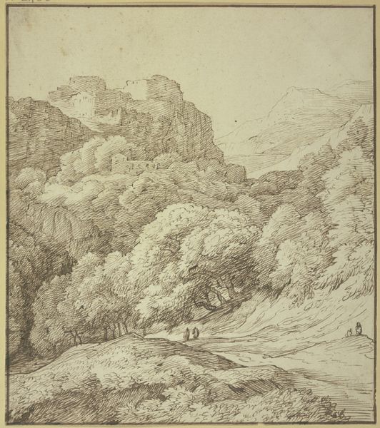 Editor: Here we have Gaspard Dughet's "Mountain Landscape with Two Figures in Foreground," a drawing of uncertain date rendered in pencil, chalk, and graphite on paper. I'm struck by the immensity of the landscape as compared to the almost diminutive figures. How do you interpret this work, especially its sense of scale? Curator: The dramatic landscape is fascinating when contextualized within the history of landscape art and colonialism. These "untamed" landscapes often served as a backdrop for European narratives of exploration and domination. Who do you think those figures might represent and what do they mean in relation to this landscape? Editor: I'm not sure. Maybe travelers or even settlers? But the scale makes them seem so vulnerable, like they’re at the mercy of nature. Curator: Precisely. And this vulnerability is key. Consider how the romantic idealization of nature can sometimes mask the exploitation and displacement of Indigenous populations. The sublime experience, where humans confront the overwhelming power of nature, was frequently interwoven with imperial expansion. So, perhaps their smallness is symbolic? Editor: You mean, as a visual representation of power dynamics at play during that era? So it’s not just about the beauty of the landscape itself? Curator: Absolutely. By considering the drawing within its possible historical context, we can see how aesthetics were deeply intertwined with political and social realities. Editor: Wow, I never thought about it that way. I've learned how looking at art through the lens of history can add new depth to it. Curator: And hopefully a more critical understanding of power! There's always so much more to discover when we connect art to the broader cultural narratives.