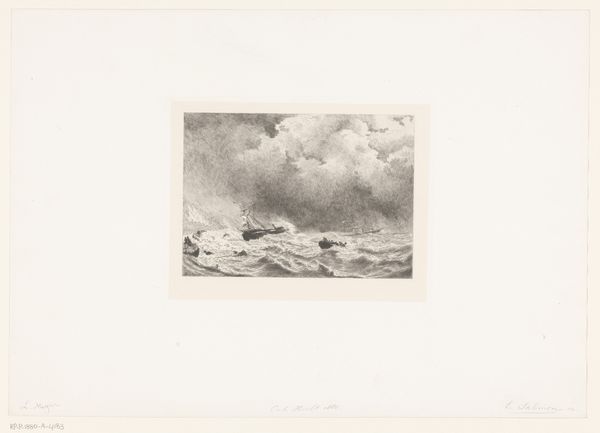 Curator: We are looking at Félix Hilaire Buhot’s print titled "Onweer", likely created between 1857 and 1898. It’s currently housed in the Rijksmuseum. The artist employed a range of techniques: etching, drawing, and working with ink and charcoal to depict this landscape. My first impression: there is a sense of urgency to the composition with the large cloud formations, which have a sense of darkness about them. Editor: The visual weight definitely pulls me into that sky. This is an intriguing mix of delicacy and force. Considering Buhot’s involvement with Impressionism, it's tempting to connect this weather scene to broader anxieties around industrialization, especially climate change. The rural landscape here almost becomes a stage for modern ecological drama, a space threatened by larger, unseen forces. The figures feel so small, they appear overwhelmed by what's looming over them. Curator: Absolutely. You can read a tension into this work in terms of humankind versus nature, that struggle plays into an even older visual vocabulary. Take, for instance, the presence of storm clouds and windswept trees, evoking established symbols of turmoil. Think, the deluge, the wrath of God, nature's indomitable will... Are those biblical overtones in conflict with the era’s burgeoning scientific rationality, do you think? Editor: Perhaps there’s an integration there, not necessarily a conflict. Consider that during the period of the "Onweer"'s creation, natural disasters became ever more politicized. The rapid developments of modernity demanded explanations and accountability, so to use the deluge as an artful backdrop perhaps infuses those conversations with greater historical nuance, and lends an interesting new edge to conversations on modern culpability. Curator: A very crucial point, I'd say, one that reminds us of art's unique position as a dialogue between the then and the now, speaking through signs, symbols and stories across generations. Editor: And it really reveals a certain contemporary thread, allowing a late nineteenth-century landscape to still resonate within a very twenty-first-century crisis.