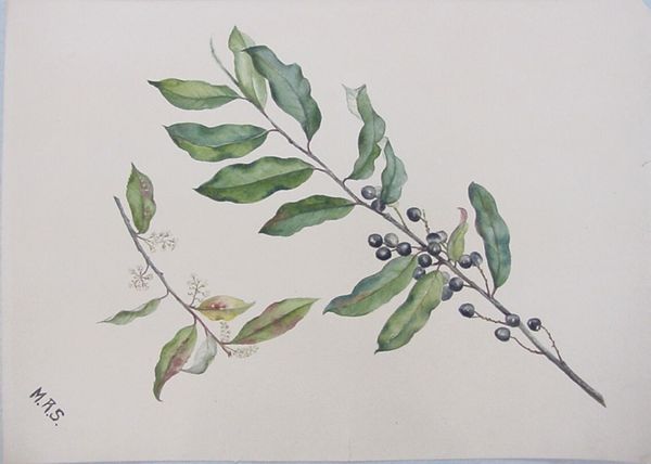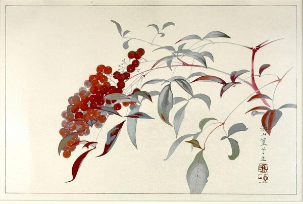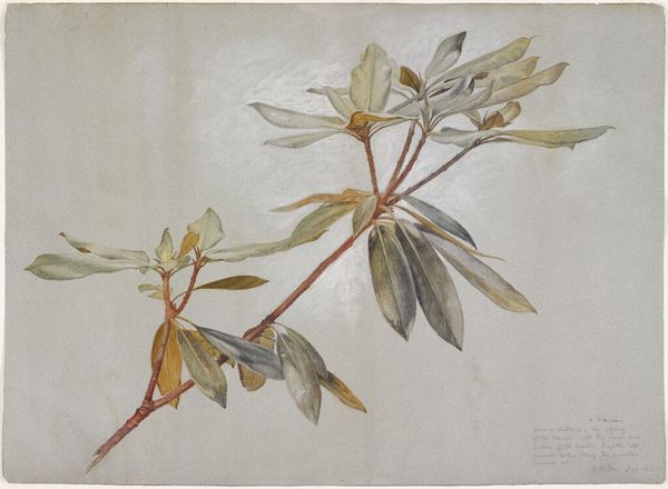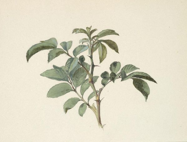 Curator: Charles Herbert, born in 1829, rendered this delicate study, "Walnut Branch," sometime during his career. It is currently held at the Harvard Art Museums. Editor: There's a quiet elegance to it. The muted greens and blues give it a serene, almost melancholic feel. Curator: Botanical studies were often incorporated into broader scientific and educational initiatives. Herbert likely aimed to accurately document the plant's specific characteristics. Editor: The composition is interesting. The branch fills only the top portion of the frame, creating a sense of spaciousness. I'm also drawn to the artist's use of color. Curator: Indeed. Herbert's choice to depict certain leaves in gray-blue hues adds an intriguing contrast to the overall green palette. Editor: It draws my eyes! The watercolor technique lends a soft, almost ethereal quality to the plant, giving it a certain grace. Curator: Reflecting on this piece, one is reminded of the role artists played in shaping public understanding of the natural world. Editor: And, on a purely visual level, its restrained palette and delicate rendering create a truly peaceful viewing experience.