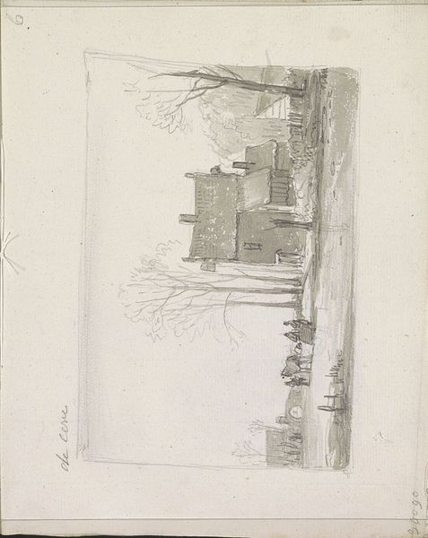Curator: This drawing is by Andreas Schelfhout, titled "Skaters on a Frozen Canal on the Edge of a Village," dating from around 1825 to 1829. The Rijksmuseum houses it. Editor: My initial response is of sparseness and quietude. The skeletal trees, the soft pencil strokes – it feels like a memory rather than a depiction. Curator: It is a delicate rendering of a typically Dutch winter scene. Look closely at how Schelfhout uses line to create depth; the varying pressures define foreground and background. The texture he creates in the ice is especially compelling. Editor: I see an underlying theme of community and survival during winter's stark embrace, if you will. Figures huddled together skating – an act of practicality, moving from place to place, but also clearly leisure and enjoyment despite hardship. Is there a celebration here, I wonder, masked within a working landscape? Curator: Perhaps. But structurally, note how the verticality of the trees is juxtaposed against the horizontal stretch of the frozen canal. The artist has also skillfully constructed two distinct spatial registers – the high, dominant village against the active foreground scene below. The light etches everything distinctly in tones that complement this divide and yet maintain pictorial harmony. Editor: That is well observed. Consider the bare trees, though; their upward reaching limbs could symbolize aspiration or the cyclical nature of life – dormancy followed by eventual rebirth, certainly speaking of the Romantic leanings so in tune in the Netherlands during this era. Also, the depiction of figures, somewhat generic, suggests a universal humanity. Curator: While I agree with the Romantic elements you describe, the reduction to the most vital compositional forms is also striking: horizontal lines meet a carefully designed vertical organization, demonstrating pictorial rigor beyond mere sentimental naturalism. Editor: Well, together, it is perhaps about something very human, as are most cultural symbols – an equilibrium that depicts rigor as a response to our place, as part of life that makes everything better in community as time moves on. Curator: An intriguing blend of form and feeling, captured with remarkable subtlety. Editor: Indeed, food for thought, rendered exquisitely in pencil.