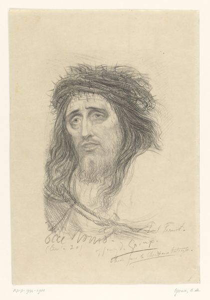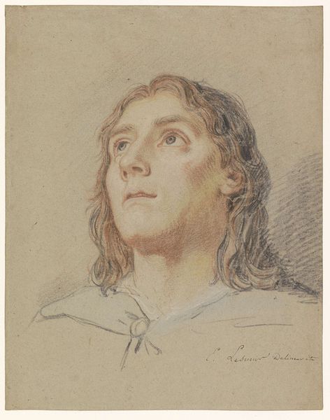 Curator: Right, let’s talk about Jean Bernard’s “Hoofd van een man (Christus?)” which roughly translates to "Head of a Man (Christ?)" created sometime between 1775 and 1833. It’s a pencil drawing, currently housed here at the Rijksmuseum. Editor: It strikes me as gentle, almost melancholic. The lines are so soft, they give the face a very vulnerable quality. A tentative peace emanates from his steady gaze. Curator: Bernard was quite the activist in his own way, pushing the boundaries of caricature and portraiture. This piece, though labeled as possibly Christ, feels more like a study in idealized masculinity, pulling from classical aesthetics while hinting at revolutionary ideals. Think about the context, the shifting sands of power in Europe at that time. Editor: You're right, it's less devotional and more about exploring a certain kind of… stoicism. The tight cropping forces us into this very intimate encounter. Are we meant to see the divine in the everyday man? Or is it about universalizing suffering through the image of a Christ-like figure? Curator: Perhaps both? Bernard plays with ambiguity. Is he subverting religious imagery, or simply reimagining it? I find his realism arresting and so moving in its quiet simplicity, just rendered in humble pencil on paper. He captures something fundamentally human here. A universality which feels so current even centuries later. Editor: I’m struck by the gaze—unwavering, almost challenging. There’s a definite call to acknowledge the burdens carried. Maybe it's less about deification, more about solidarity. In light of current socio-political conflicts, seeing art of a serene, even sorrowful figure—it speaks volumes to the enduring struggle for justice and empathy. Curator: It seems to me, our experience changes based on where we find ourselves, doesn't it? Context gives rise to different feelings, reflections, reactions... Editor: Precisely. And, to me, that’s what makes engaging with art so perpetually relevant.