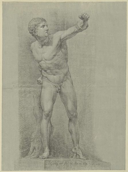Editor: This is "Zittend mannelijk naakt, het linkerbeen op de rechterknie" or "Seated Male Nude, Left Leg on Right Knee," a charcoal drawing by Jean Grandjean, created between 1765 and 1781. It has a serious, almost somber, mood for me. How do you interpret this work? Curator: The subject certainly exudes seriousness, doesn’t he? But what does that seriousness signify within the context of late 18th-century Neoclassicism? These academic studies often served as more than just anatomical exercises. They reflect the era's fascination with the classical male form, seen as embodying virtue and civic duty. Consider the French Revolution brewing at the time – how does this idealized depiction intersect with ideas about masculinity, power, and the citizen? Editor: So, it's not just about the artist practicing anatomy, it’s also making a statement about ideals of manhood at that time? Curator: Precisely! Think about who had access to this kind of artistic training and the art world. Male artists, predominantly. Then reflect on the models themselves and how they are being viewed through a white male gaze. Who were they, what was their role, and how are they rendered powerless? How do contemporary notions of identity and power relations affect our reading of this artwork today? Does it glorify an oppressive past, or does it offer space for reinterpretation? Editor: I hadn't considered the power dynamics inherent in the creation and viewing of the work. Thanks, it really changes my perception of this drawing. Curator: That's the power of art history – not just describing what we see, but questioning why we see it that way and what it means in different cultural contexts.