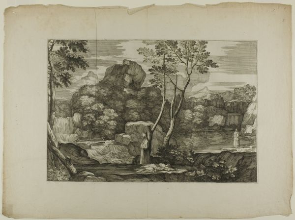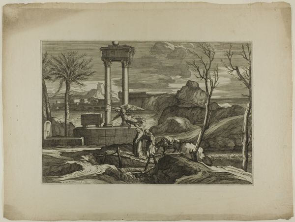 This is Sebastien Bourdon’s print, "Joseph in Egypt," now at the Art Institute of Chicago. It is executed on paper. The print presents a stark yet inviting landscape. Note how the composition is structured around receding planes, leading the eye from the detailed foreground to the distant, hazy architecture. The contrast between the dark, heavily etched areas and the lighter, open spaces creates a visual rhythm, inviting you to explore the scene. Bourdon masterfully uses line and texture to define form and space. The intricate network of lines in the foreground contrasts with the smoother, less defined areas in the background, creating a sense of depth and atmosphere. This interplay between precision and ambiguity is not merely decorative; it reflects a broader philosophical interest in perception and representation. Bourdon challenges fixed meanings, inviting us to question what we see. The print's formal qualities—its structured composition and subtle manipulation of light and shadow—function as part of a larger cultural dialogue. It is a site of ongoing interpretation and re-interpretation.