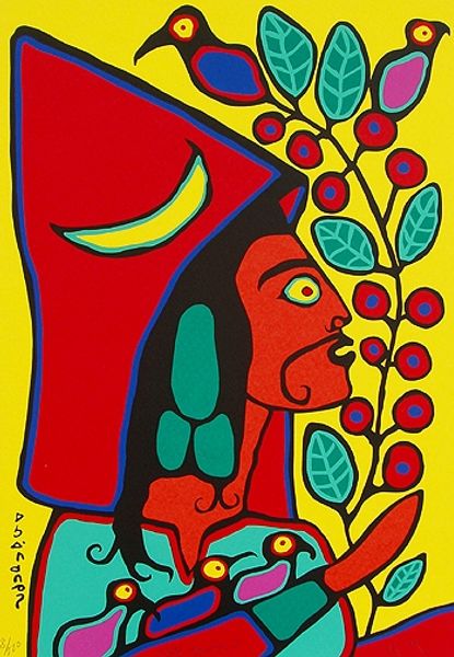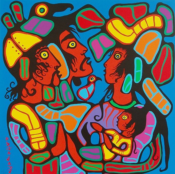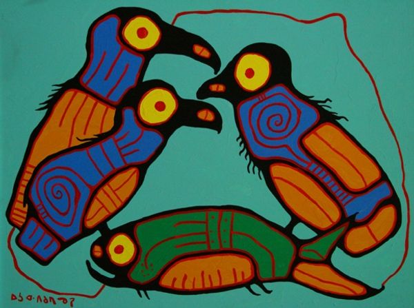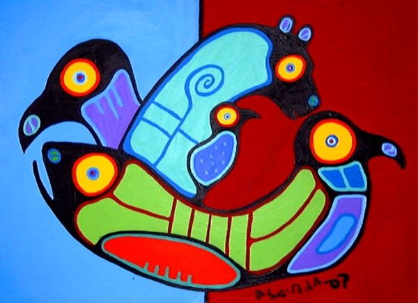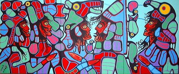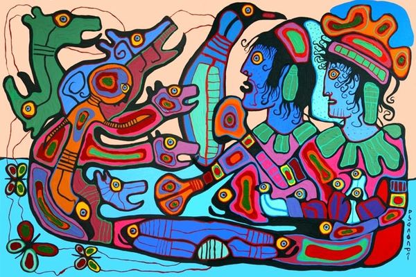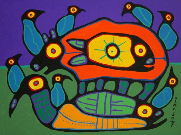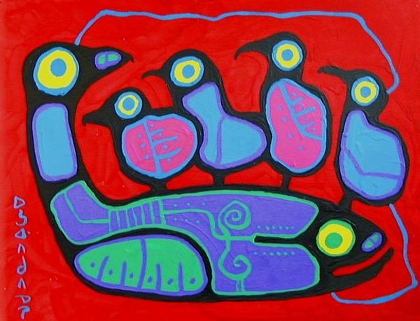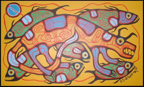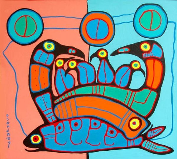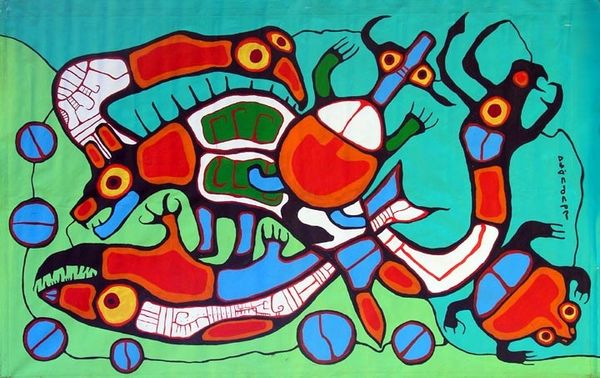 Curator: Norval Morrisseau's 1995 acrylic painting, "Bear, Bird, Fish and Chicks," presents a vibrant composition using bold colors and thick, black outlines to depict interconnected animal forms. What strikes you upon first glance? Editor: The color palette immediately grabs my attention – the turquoise juxtaposed with the fiery red creates an intriguing tension, almost suggesting two separate realms within the single canvas. There is an almost playful dynamism through how the various biomorphic shapes interlock and are stacked. Curator: Morrisseau was a groundbreaking Anishinaabe artist. His works are deeply rooted in the pictographic traditions and spiritual beliefs of his people, he often revealed sacred knowledge. Note the consistent line weight outlining each distinct area of flat color – it produces an organized composition that emphasizes each animal’s symbolic role. Editor: Absolutely. The iconography seems almost dreamlike; for instance, how the bear envelops the birds nestled near what I presume is the fish shape above, I get a sense of maternal protection. Then those orbs float above, creating another layer of symbolic elements possibly suggestive of worlds beyond our own. Curator: Precisely. Morrisseau masterfully interweaves interconnectedness through generations within his animal forms. Note too the employment of "x-ray style," to highlight their inner spirits – a trait typical to Morrisseau’s innovative way of presenting Ojibwe cosmology. It offers viewers entry into these spiritual dimensions. Editor: And these colors. He often painted what was seen to him in his vision quests—I wonder how they reflect these visions? The contrast that the green-on-red, versus the similar colors blue-on-blue offers more questions to ponder. Are these inversions to provide different perspectives to ponder this interwoven-ness? Curator: Intriguing readings of color are indeed central to considering how meaning-making operates here. The painting also deploys an element of symmetry as the animals ascend the panel and connect the different color planes. What starts out as binary opposition yields harmonious integration as they rise together. Editor: It seems to advocate for nature’s balance through visual means, reminding us that diverse existence are necessary through those simple, declarative shapes and lines. I’m struck by the enduring impact of images when imbued with personal narrative, especially here where Morrisseau renders something undeniably universal within his cosmology. Curator: It leaves me reflecting on Morrisseau’s skill in expressing this balance with forms abstracted in bold outline, demonstrating the interconnectedness and equilibrium necessary for this shared ecosystem.