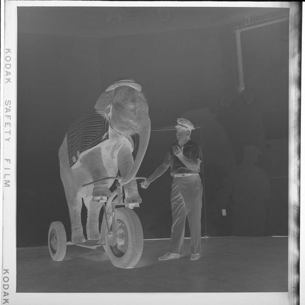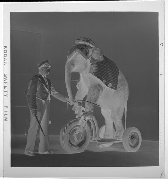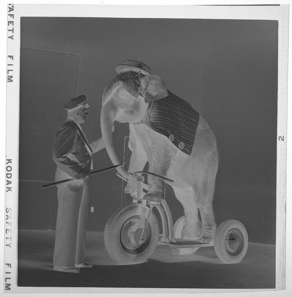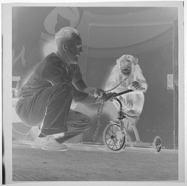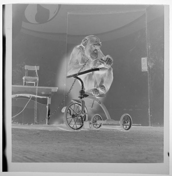 Curator: This intriguing photograph from Jack Gould is called *Untitled (monkey sitting next to tricycle)*. The image, a modest 5.7 x 5.7 cm, currently resides at the Harvard Art Museums. Editor: It's haunting, isn't it? Like a faded memory or a dream you can't quite grasp. The monkey's gaze is so pensive. Curator: Indeed. The work's power lies in its unsettling juxtaposition of innocence and captivity. The tricycle becomes a symbol of thwarted freedom, a poignant commentary on animal exploitation and agency. Editor: I see it too. It's sad and funny at the same time, like a Beckett play. Maybe the monkey is waiting for Godot on that trike, forever stuck in a loop. Curator: Perhaps Gould sought to critique societal structures, revealing the absurdity and cruelty embedded within our interactions with the animal kingdom. Editor: You always bring it back to the social stuff, don't you? Still, it makes you think. I guess it's a ride we're all on, in a way. Curator: Precisely. It prompts us to consider our roles and responsibilities within the broader context of power dynamics. Editor: Right. I’m going to go home and hug my cat.