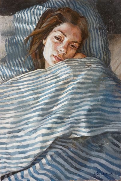 Editor: We’re looking at "Sleep Selfie II," an oil painting by Valeria Duca. It portrays a woman asleep, and there's something so intimate about the close-up view. What do you make of a painting that depicts such a private moment, and what does it tell us about the artist's intention? Curator: It’s fascinating how this modern painting plays with the tradition of portraiture, transforming it into a very personal statement. Think about the history of portraiture – typically commissioned to project power, wealth, or status. Here, Duca uses oil paint to capture vulnerability. What's striking is the way she uses the selfie – usually associated with curated online personas – to present something seemingly unmediated. Editor: So you're saying it subverts the expectations we have of both portraiture and the selfie as forms of self-representation? Curator: Precisely. It begs the question: how does social media culture change our perception of self, and how does that translate into art? Consider how the museum itself shapes this work’s meaning. Is this intimacy something to be revered, dissected, or is it another fleeting image to scroll past? Editor: That makes me consider the almost voyeuristic perspective of the viewer. Do you think the title is suggesting a level of self-awareness in the act of portraying oneself asleep? Curator: Yes, the “selfie” aspect points towards a performative element even within purported vulnerability. What do you make of that tension between exposure and concealment? It makes me wonder about the relationship between artist, subject, and viewer, doesn't it? Editor: I hadn't thought of the artist as performer but, when considering this in context of art history and modernism, the layers become more evident. Curator: Exactly. Ultimately, a piece like this is interesting, and encourages us to think critically about the artifice inherent in all representations, even those claiming to be authentic or spontaneous. Editor: I now realize that its artistic merit really rests on those complexities surrounding modern digital culture. Thank you!