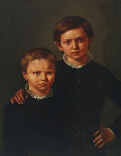 Curator: Looking at this, the prevailing mood is one of quiet observation, don’t you think? There's an inherent stillness despite the informal positioning of the children. Editor: Indeed. And the somewhat muted color palette only amplifies that mood of thoughtful repose. What are we seeing exactly? Curator: Here we have "The Binning Children," dating back to circa 1811. It’s an oil painting attributed to the skilled hand of Henry Raeburn. Notice the interplay of academic and romantic styles. Editor: Immediately, what grabs my attention is how Raeburn employs tonal modelling here. See how he models those deep maroons and tans to construct space? And then juxtaposes the children's pale ruffled collars against that earthier backdrop to generate pictorial tension. Curator: Beyond the formal composition, Raeburn appears to capture the ethos of the time. He alludes to the enduring archetype of innocence juxtaposed against the weight and seriousness of adulthood. We’re invited to consider what futures these children will inherit. Editor: Certainly. Observe too how the costumes almost militarize the boys—the implied symmetry with those brass buttons emphasizes repetition and order, concepts essential to art theory. But then these elements are deliberately subverted. The angle of the boy on the right disrupts the grid; Raeburn carefully balances and subverts in this image. Curator: Absolutely! And it speaks to how cultural narratives get inscribed on bodies through clothing, even at a young age. Note how this era was deeply invested in solidifying class distinctions. Clothing operates as more than simple aesthetics—it carries profound cultural and symbolic value. Editor: I see what you mean. But stepping back, for me, the piece really sings because of how Raeburn balances order and chaos, and repetition and subversion so elegantly. Curator: Right! It’s that very tension between structure and feeling which renders "The Binning Children" such an enduring window into an era and the psychological makeup of its people. Editor: Agreed. And it speaks to the strength of art to reveal systems of construction that we might otherwise accept unthinkingly.