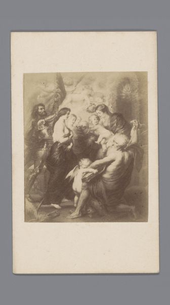 Curator: This intriguing print, created sometime between 1851 and 1865, is titled "Amor Surrounded by Four People" and comes to us from the hand of Célestin Nanteuil. What leaps out at you initially? Editor: A sort of sepia-toned dream. There's a distinct lightness to the work, but almost a somber, reflective quality, heightened by the aged paper perhaps? Cupid's certainly causing chaos amid the classical figures! Curator: Exactly! Nanteuil's Romantic sensibilities shine here. We have Cupid, the god of love, of course, poised with his arrow. What I see is a confluence of Romanticism's embrace of emotion and its fascination with historical and allegorical subjects. Editor: I love how it merges a somewhat history-painting style with those soft, light pencil strokes and figuration, as it's listed. There is such an intimate feeling created by such a classical topic... Cupid's usually about the fanfare, the seduction, the boldness, but here it looks so demure, if impish! Curator: The piece itself can be read through the lens of nineteenth-century societal expectations and anxieties around love, marriage, and social roles, so to me, his somewhat docile character may reflect that social constriction. In choosing printmaking, it democratized its message and imagery too. Editor: Do you think its history impacts our reading of the subjects today? Does it become simply 'an artwork of its time' instead of a relatable depiction? Because I actually love its open and more relaxed approach, and can't shake that quiet initial somberness I noticed... Curator: The history imbues the figures and story, surely! As historians and artists, aren't we trying to relate them together even when we face conflict, trying to discover a place of common appreciation? I see that in its approach of its own period of anxiety toward modern ideas. Editor: True, very well observed, like finding hidden chambers that are there but have been forgotten, for many years perhaps... Thank you!