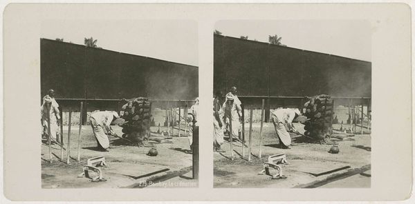 Editor: This is a photograph taken by Frances Benjamin Johnston, titled "Races, Negroes: United States. Virginia. Hampton." It appears to document students at the Hampton Normal and Industrial School. I notice the emphasis on geometric forms created by the bricklaying and plastering. What do you make of the composition and arrangement of these images? Curator: The composition reveals a carefully structured duality. Note the stark contrast between the rough texture of brick and the smooth finish of plaster. This juxtaposition is further emphasized by the distinct spatial arrangements in each frame. What might these contrasts signify? Editor: Perhaps the stages of development or different facets of the students’ education? It's interesting how Johnston uses light and shadow to highlight the physicality of the work. Curator: Precisely. The interplay of light and shadow, coupled with the repetitive lines of the brickwork, serves to underscore the transformative power of labor and skill. Consider how the artist uses these formal elements to convey a particular message about the value of industrial training. Editor: I see now. It's about more than just documentation; it's a deliberate artistic statement. Thank you for that insight. Curator: Indeed, close attention to form reveals layers of meaning.