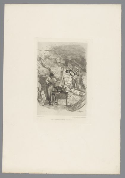 Curator: This engraving from 1875 by Edmond Morin is titled "Soldier Standing by Two Women with Young Children". It’s currently held in the Rijksmuseum. Editor: It's striking how much the etching resembles a faded photograph. The linework is incredibly detailed, but the overall tone is subdued, even melancholic. Curator: Genre paintings like this gained traction through printmaking. It enabled wider distribution of scenes depicting everyday life, furthering social commentary and debate on military life, especially in post-conflict societies. Editor: Absolutely. And considering the tools available, engraving like this demanded significant labour. Imagine the hand skills necessary to create this range of tones and textures simply by carving lines. Curator: Morin’s portrayal offers a peek into post-war society. Look at the arrangement of figures – a stoic soldier positioned adjacent to the vulnerability of women and children. It evokes questions around support and social disruption related to the military class. Editor: Indeed, you're drawn to the contrast of hard and soft. The rigidity of the soldier is made only sharper when seen next to those women and children—an image that feels designed to ask if they will be provided for. I'm intrigued by the choice to place them within what appears to be a domestic interior overtaken by natural growth and decay. Curator: That backdrop likely represents the ambiguous social terrain. Note, too, how this scene appeared to an audience freshly undergoing shifts of increased industrial output. Images depicting families gained heightened meaning during societal change. Editor: The method, too, impacts meaning, doesn’t it? An engraving lends itself to distribution; perhaps it asks how social burdens should be shared during eras of social shift. Curator: It serves as a reminder of the profound and lasting effects of societal actions upon civilian life, reflecting on the social contract in moments of disruption. Editor: Yes, a single moment etched into paper, filled with complexity, loss, labor, and profound consideration.