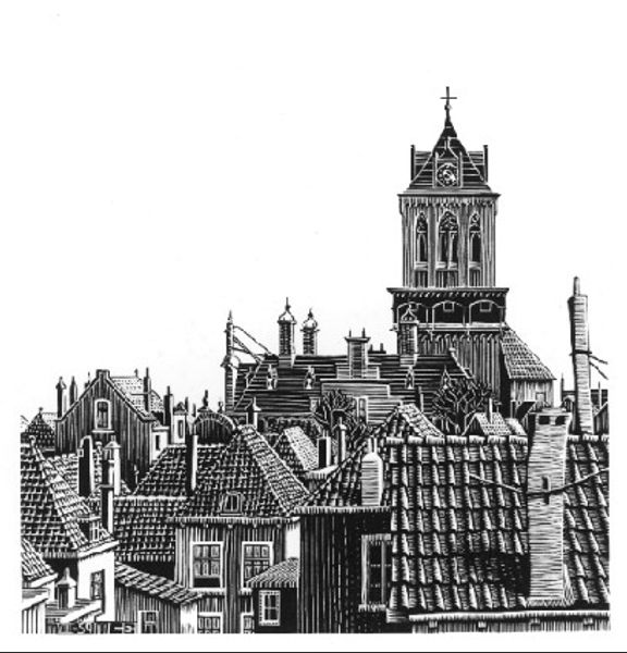 M.C. Escher made this woodcut, Oostpoort, without a date, through the deliberate process of carving into wood. The black and white contrast gives it a stark, graphic quality, but there's also a real tenderness in the details. Look at how he renders the sky with parallel lines, like a meditative exercise. Those lines create a sense of depth and atmosphere, but also flatten the image, pushing it towards abstraction. And then there are the buildings, each brick and tile meticulously rendered, contrasting with the organic forms of the trees. See the little tree in front of the gatehouse? It's so delicately drawn, almost like a gesture. That contrast is what makes this print so compelling to me. Escher's print reminds me of the work of Albrecht Dürer, who also explored the possibilities of line and form in his engravings. Art is just an ongoing conversation across time, a constant exchange of ideas and perspectives.
