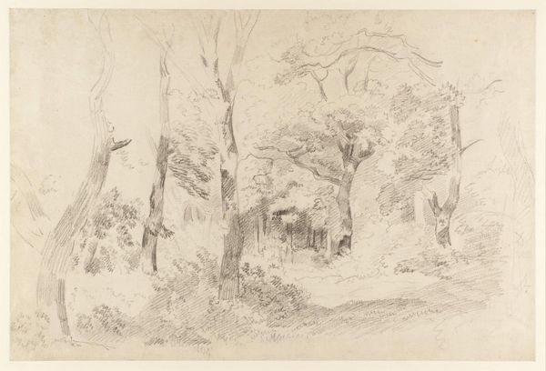 Curator: The artwork before us, simply titled "Trees and Cottage [verso]," appears to be a study executed with pencil and ink. My initial reaction is the sketchiness conveys an ephemeral quality. There's a definite sense of immediacy. Editor: Yes, there's an intriguing raw quality to it. It seems like a quickly rendered impression, a moment captured rather than a polished, finished product. I find myself considering the labor involved; it seems John Marin prioritized efficiency and capturing the essential form, a deliberate choice that downplays the artifice typically associated with drawing. Curator: Absolutely, and considering the "verso" in the title, we should note how this adds a layer to the work's reception, almost inviting speculation about the artist's process and intention. Knowing it's on the back of another piece prompts us to rethink its significance, to what it was he devoted most labor? Editor: That placement raises fascinating questions about value, doesn't it? What was on the "recto" that warranted more "precious" treatment? And conversely, what is Marin telling us by allocating the materials and his artistic attention this way? Curator: Exactly. And the subject matter - a modest cottage nearly swallowed by the surrounding trees – further feeds that line of inquiry. What cultural ideas about landscape are at play here? The picturesque ideal being overgrown by natural forces? Editor: Perhaps this wasn’t intended for the gallery walls at all. The very fact that it survives and is exhibited offers insight into how perceptions of value in artistic labour can shift over time, from being a fleeting sketch to an important study. Curator: Indeed. Marin gives the trees and the cottage equal weight, which I think speaks to a broader shift happening in art at this time: one away from formal representation and towards something more expressive of a personal experience in and interaction with the landscape. The image gains a power. Editor: And it makes you consider how the rise of artistic training has elevated simple, functional material into something precious and revered. An ink sketch can fetch more at auction than the labour of an artisan’s year's worth. What does that say about value in our contemporary culture? Curator: I suppose what strikes me is how this quick sketch raises questions about labor, cultural value and the way artworks circulate within institutions – far beyond any formal elements, a point I perhaps missed upon first encountering it. Editor: I'll echo that thought, I think I see the work a little bit differently now, viewing it not just as a fleeting impression, but also, perhaps more meaningfully, as a reflection of our own social values and perspectives on the art world, itself.