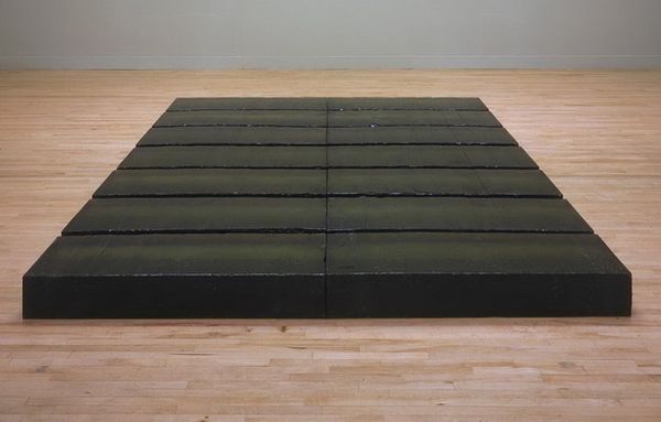 Editor: Here we have Michelangelo Pistoletto's "Doormats," an object in the Tate collection. It is literally a stack of doormats. It's so...ordinary. What do you see in it? Curator: The doormat, a threshold object, signifies entry, welcome, but also exclusion. Stacked high, it becomes monumental, almost absurd. Does this speak to you of access, or perhaps the barriers to it? Editor: I guess it could. I hadn't thought of it that way. Curator: Consider the material. Coir, derived from coconut husks, is rough, humble. Does the sheer quantity elevate or negate its inherent symbolism? Does it become more than the sum of its parts? Editor: It's like he's taking something so common and making us rethink its meaning. It’s more complex than it seems. Curator: Precisely. The cultural weight of the everyday, amplified. Editor: Thanks, I see that now.